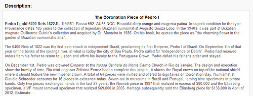 Uma deslumbrante e antiga moeda de ouro de 1822, D. Pedro I, 6400 réis, AU55 NGC, atingiu a marca de 499.375 dólares nesse 5 de janeiro, liderando o $15 million World & Ancient Coin Signature Auction, do Heritage Auctions, realizada no Waldorf-Astoria, como parte da Convenção Numismática Internacional de Nova Iorque (NYINC). O valor inclui todos as despesas da operação.