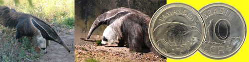 Dentre todas as espécies de tamanduás do Brasil, existe uma que está em extinção: o Myrmecophaga tridactyla ou tamanduá-bandeira. As fêmeas desse tamanduá têm um filhote por vez e é carregado nas costas da mãe até cerca de um ano de idade. Depois eles crescem, viram exterminadores de formigas e cupins e podem viver por até 25 anos. Sua extinção deve-se, principalmente, à destruição de seu habitat. Moedas de aço inoxidável, 22 mm de diâmetro, produzidas em 1993 e 1994.