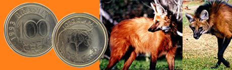 O Lobo Guará (Chrysocyon brachyurus) está entre os animais que sofrem sérios riscos de extinção dentro de nossa fauna. O Lobo Guará é um canídeo grande e de aspecto elegante, que tem como habitat natural a América do Sul. É um animal exclusivo do cerrado e sua aparência assemelha-se mais à de uma raposa que de um lobo. Isso ocorre, devido às suas pernas longas e finas. Moedas de aço inoxidável, 24 mm de diâmetro, produzidas em 1993 e 1994.