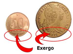 O EXERGO faz parte do CAMPO da moeda. É o espaço inferior deste onde, algumas vezes, até se tem um traço horizontal, sendo reconhecido por vários detalhes tais como a data, o local de cunhagem, a sigla do gravador ou abridor do cunho e, ocasionalmente, a letra monetária.