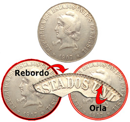 O REBORDO fica entre a ORLA e o limite da moeda. É aquela parte propositadamente mais alta e lisa feita para assegurar que a peça, quando estiver em circulação, sofra menos desgaste das informações no CAMPO.