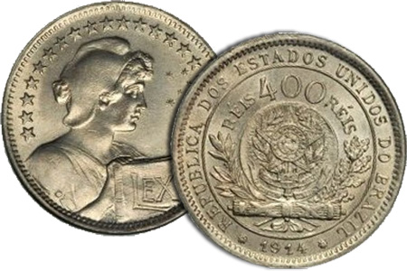 As moedas de 400 réis, em cuproníquel, produzidas em 1914 sob a direção do Dr. Ennes de Souza, então Diretor da Casa da Moeda, não deveriam jamais ter saído daquela instituição, uma vez que o Ministro da Fazenda da época, Dr. Rivadávia da Cunha Corrêa, embora tenha aprovado o modelo em ofício datado de 6 de agosto de 1914, negou autorização para que fossem colocadas em circulação.
