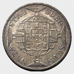 rara dos patacões onde a legenda do anverso está incorreta. Ao invés da tradicional