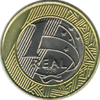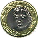 Efígie da República à direita do núcleo prateado (disco interno) e transpassando para o anel dourado (disco externo), assim posicionada constitui um dos elementos de segurança da moeda de maior denominação. No anel dourado, referência às raízes étnicas brasileiras, representada pelo grafismo encontrado em cerâmicas indígenas de origem marajoara, e a legenda "Brasil".