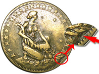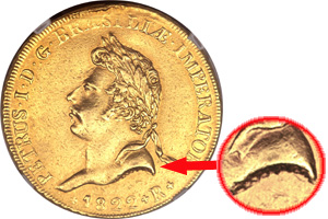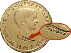 Segundo Hans Kochmann (SNB), "(...) a inscrição Z. FERREZ (Zeferino Ferrez, 1797-1851, gravador e abridor de cunhos da Casa da Moeda do Rio de Janeiro) em baixo relevo, é aposta na parte ovalada do corte do busto imperial (...)".