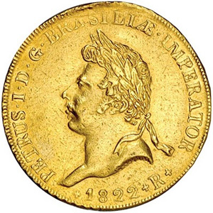 Em 1821, Dom João VI partiu com a corte de volta a Portugal. Levou com ele baús repletos de ouro retirado das casas de cunhagem do Brasil. Em 7 de setembro do ano seguinte, Pedro I proclamou a Independência do País. Para a cerimônia de coroação do novo imperador, a Casa da Moeda do Rio de Janeiro produziu peças comemorativas com o pouquíssimo ouro que restara. Foi possível cunhar apenas 64 exemplares da moeda, conhecida como Peça da Coroação.