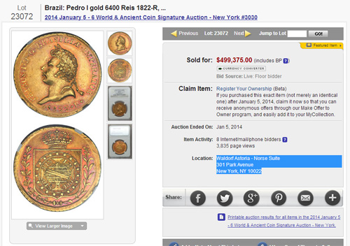Uma deslumbrante e antiga moeda de ouro de 1822, D. Pedro I, 6400 réis, AU55 NGC, atingiu a marca de 499.375 dólares nesse 5 de janeiro, liderando o $15 million World & Ancient Coin Signature Auction, do Heritage Auctions, realizada no Waldorf-Astoria, como parte da Convenção Numismática Internacional de Nova Iorque (NYINC). O valor inclui todos as despesas da operação.