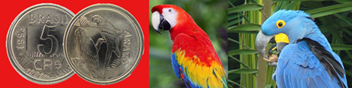 As araras são um tipo de papagaios coloridos, pertencentes a alguns gêneros da família Psittacidae. Encontram-se em estado de conservação ameaçada, graças à caça furtiva devido à sua procura como animais de estimação e, principalmente, ao desaparecimento do seu habitat. Moedas de aço inoxidável, 21 mm de diâmetro, produzidas em 1993 e 1994.