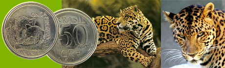 Por ser um animal tão singular, a onça-pintada, ou Panthera onca, é umas das espécies com maior índice de contrabando. Além desse, a caça ilegal, a poluição/envenenamento dos rios e a destruição do seu habitat também contribuem com sua extinção. Moedas de aço inoxidável, 23 mm de diâmetro, produzidas em 1993 e 1994.