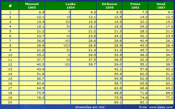 Após Mionnet, ainda no século 19, outras medidas para moedas foram estabelecidas com certa paridade entre elas. Os tamanhos das moedas eram numeradas em até 20 diâmetros diferentes possíveis.