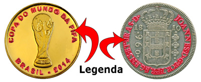 É muito comum encontrar em moedas inscrições que transmitem o momento político ou transitório em que se encontra a nação. Muitas vezes servem para enaltecer seu soberano, outras vezes para apenas identificá-lo. Ou, simplesmente, para fazer alusão a um momento histórico, patriótico, filosófico ou institucional por qual se está passando. Costumam ser abreviadas e ocupam o CAMPO da moeda muitas vezes acompanhando a ORLA. Nas moedas antigas eram comum legendas escritas em latim. O nome do país é uma inscrição comum, principalmente em nossas moedas atuais.