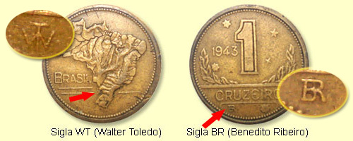 Na moeda de 1 Cruzeiro, ao lado esquerdo do mapa, na altura do estado de Santa Catarina, aparece a sigla WT, de Walter Rodrigues Toledo. No reverso, a sigla é BR, de Benedito Ribeiro, e está localizada à esquerda, embaixo do traço horizontal de pontas curvas sob a palavra "CRUZEIRO".