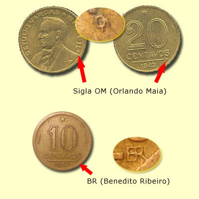 Na moeda de 10 centavos, no lado com a imagem de Vargas (anverso), está a sigla OM, de Orlando Moutinho Maia, logo após a palavra "BRASIL" e, do outro lado (reverso), aparece BR, de Benedito de Araújo Ribeiro, à direita do traço separador da era.