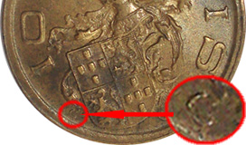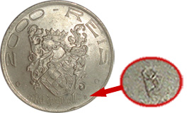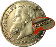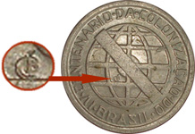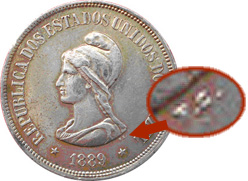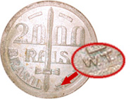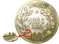 Na produção das moedas de 1901 — únicas a trazer a era em algarismos romanos (MCMI) — cunhadas fora do Brasil (Alemanha, Inglaterra, Áustria, França e Bélgica), aparece entre as estrelas uma discreta sigla PT, quase imperceptível, pertencente ao gravador francês Paulim Tasset.
