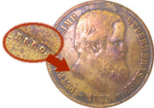 As iniciais E.S.R.C. são encontradas nas moedas de bronze de 1873 a 1880.